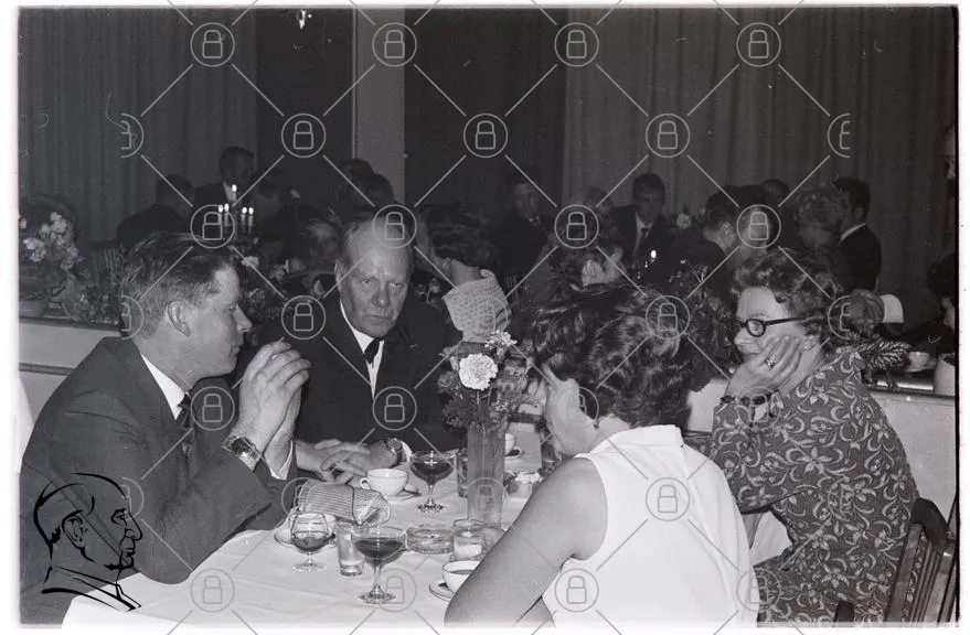 middag, fest, människor, bord, kläder, 1960-tal, glas, blommor, samtal, svartvitt, eleganta, dukning, sällskap, ljus, ansikten, uttryck, socialt, samling, evenemang, tradition, kultur, gemenskap, mat, dryck, dekoration, bakgrund, stämning, interaktion, festligheter, historisk