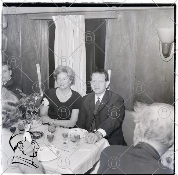 middag, fest, sällskap, kläder, 1960-tal, svartvitt, bord, glas, blommor, leenden, män, kvinnor, inredning, trä, duk, tallrikar, servetter, samtal, socialt, eleganta, porträtt, samling, festligheter, interiör, tradition, stil, gemenskap, minnen, nostalgi, fotografi