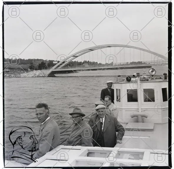 båt, män, vatten, bro, landskap, sjö, arkitektur, resa, utomhus, himmel, kläder, hatt, skjorta, kavaj, flod, transport, sightseeing, sommar, skärgård, båttur