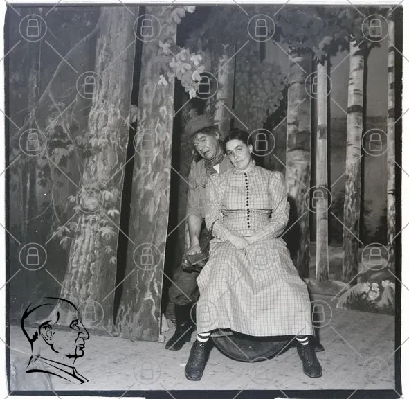 svartvit, teaterscen, skog, träd, man, kvinna, kostym, klänning, hatt, scenografi, teater, föreställning, vintage, gammaldags, skådespelare, sittande, rekvisita, dramatisk, konstnärlig, 1900-tal