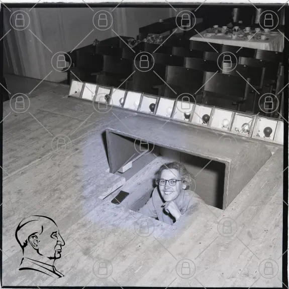 man, glasögon, hål, golv, scen, teater, kontrollpanel, lampor, svartvit, interiör, teknik, belysning, leende, trä, auditorium, sittplatser, mikrofon, vintage, retro, 1900-tal