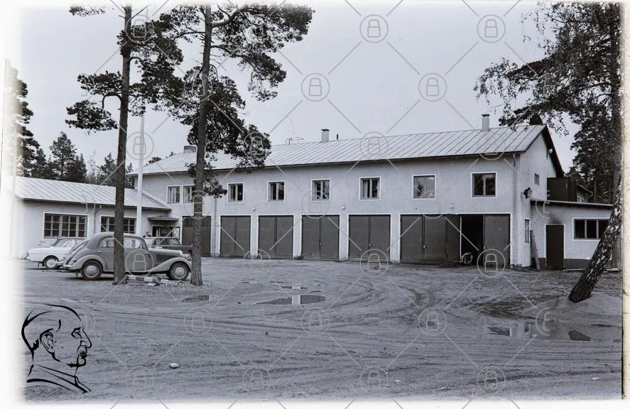 byggnad, garage, träd, bil, grus, tak, fönster, dörrar, gård, gammal, svartvit, landskap, asfalt, parkering, väg, natur, svensk, arkitektur, 1900-tal, fordon, miljö, utomhus, struktur, historia, landsbygd, skog, gårdsplan, renovering, traditionell, industriell