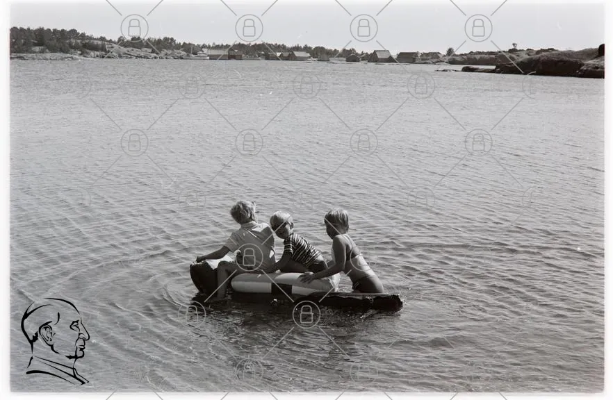 barn, simma, båt, sommar, vatten, lek, strand, skärgård, svartvitt, natur, hus, familj, vänskap, nöje, fritid