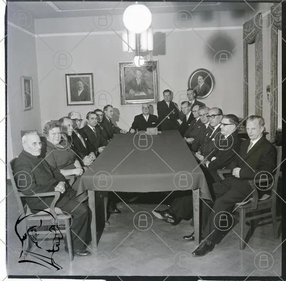 möte, bord, personer, kostymer, inomhus, svartvitt, fotografi, affärsmän, diskussion, 1940-tal, porträtt, lampor, stolar, formell, samling, grupp, ledare, traditionell, kläder, interiör, väggar, fönster, dokument, ansikten, uttryck, stil, historia, samarbete, organisation, representation