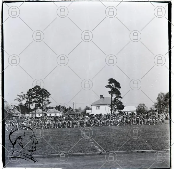 svartvitt, gruppfoto, människor, utomhus, gräs, träd, hus, himmel, samling, landskap, byggnader, natur, fält, linje, dagtid