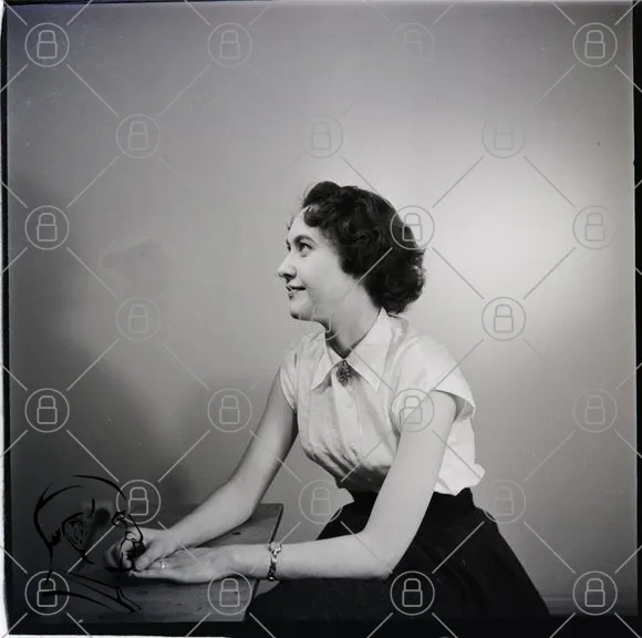 kvinna, porträtt, 1950-tal, svartvitt, kläder, leende, sittande, frisyr, armband, bord, bakgrund, mode, stil, ungdom, fotografi, vintage, uttryck, ansikte, elegant, klassisk