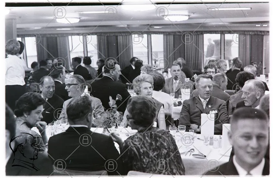 middag, fest, människor, kläder, bord, mat, dryck, glas, skratt, 1950-tal, svartvitt, samling, socialt, båt, fönster, dekoration, blommor, samtal, eleganta, stämning