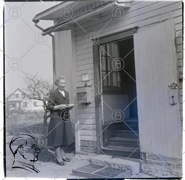 kvinna, hus, dörr, trappa, brevinkast, fönster, trädgård, landskap, svartvitt, kläder, 1950-tal, post, entré, gammal, byggnad, utomhus, stil, traditionell, kvinna i kjol, hem, natur, ljus, skugga, tidsepok, fotografi, historia, vardag, samhälle, kultur