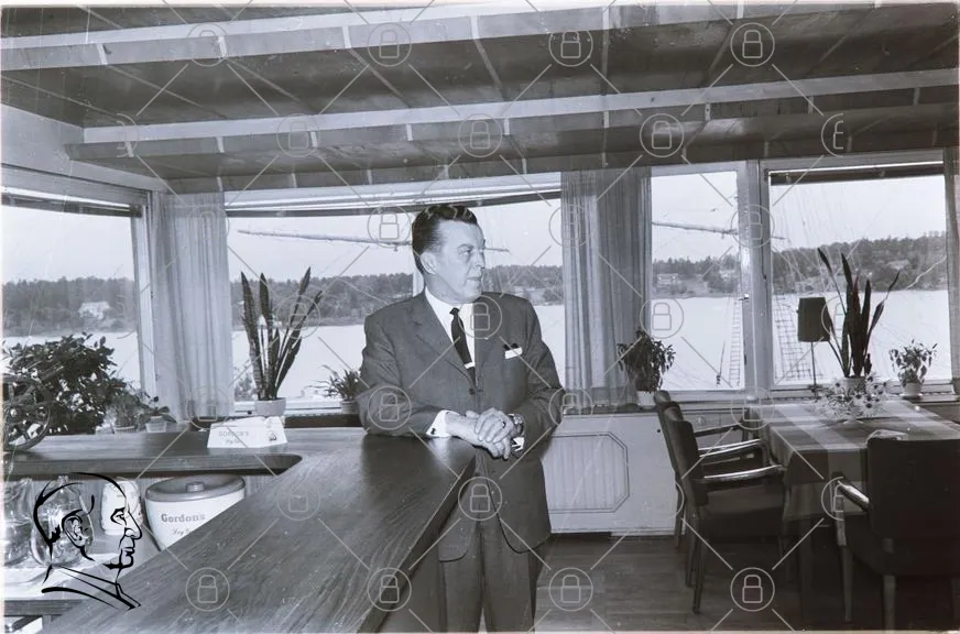 man, kostym, bar, fönster, sjö, restaurang, inredning, svartvitt, 1960-tal, möbler, bord, stolar, växter, utsikt, professionell, stil, affärsmann, interiör, retro, klassisk, elegans, skandinavisk, atmosfär, social, samvaro, stilren, tidlös, affärsmöte, service, välkomnande