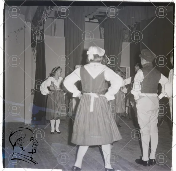 dans, folkdräkt, traditionell, fest, 1950-tal, svartvitt, dansare, scen, kultur, kläder, musik, evenemang, samling, glädje, rörelse, historisk, festlighet, gemenskap, uppträdande, dansgolv, klänning