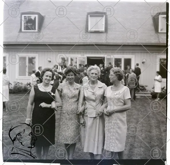kvinnor, fest, trädgård, hus, svartvitt, klänningar, blommor, leenden, 1960-tal, sällskap, familj, samling, utomhus, fönster, gräs, eleganta, tradition, minnen, glädje, socialt, fotografering, vintage, stil, gemenskap, kläder, smycken, kvinnor i fokus, bakgrund, människor