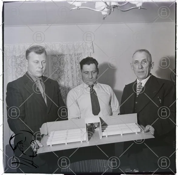 män, modell, byggnad, presentation, 1950-tal, kostym, skägg, bord, inomhus, fotografi, arkitektur, trä, plan, teknik, grupp, samarbete, design, projekt, hantverk, tradition, historia, svartvitt, detaljer, kreativitet, arbete, ingenjör, innovation, material, struktur, föreslagna