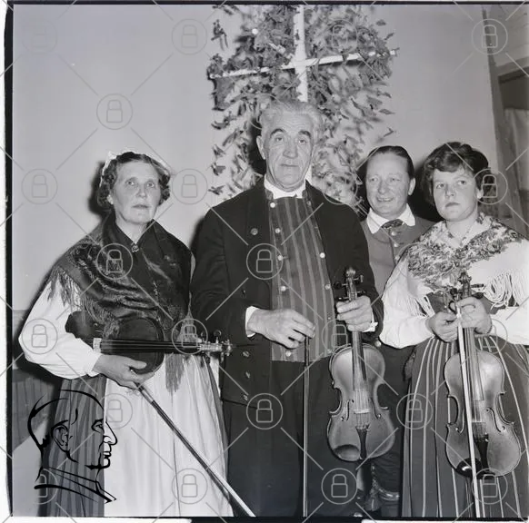 traditionell, kläder, folkmusik, fiol, grupp, svartvitt, porträtt, kultur, fest, gammaldags, blomsterkrans, kors, man, kvinna, barn, musik, samling, historisk, svensk, folkdräkt, instrument, familj, festligheter, fotografering, 1900-tal, artister, uppträdande, glädje, gemenskap, minnen