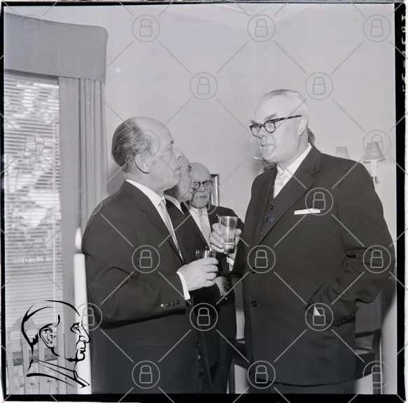 män, kostymer, glas, samtal, inomhus, 1950-tal, affärsmöte, svartvitt, interiör, lampor, fönster, kläder, stil, professionella, socialt, nätverkande, eleganta, uttryck, diskussion, grupp, formell, vintage, traditionell, affärsfolk, samling, evenemang, kontor, stiligt, representation