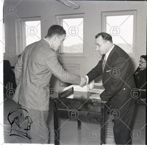 män, handskakning, kontor, 1950-tal, affärsmöte, dokument, fönster, bord, kläder, svartvitt, professionellt, interiör, samarbete, förhandling, affärsrelationer