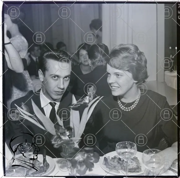 middag, fest, par, kläder, 1960-tal, svartvitt, bord, mat, dryck, blommor, leende, eleganta, sällskap, glas, dekoration, restaurang, socialt, ungdomar, smycken, servett, tallrikar, stämning, samtal, skratt, belysning, bakgrund, ansikten, uttryck, stil