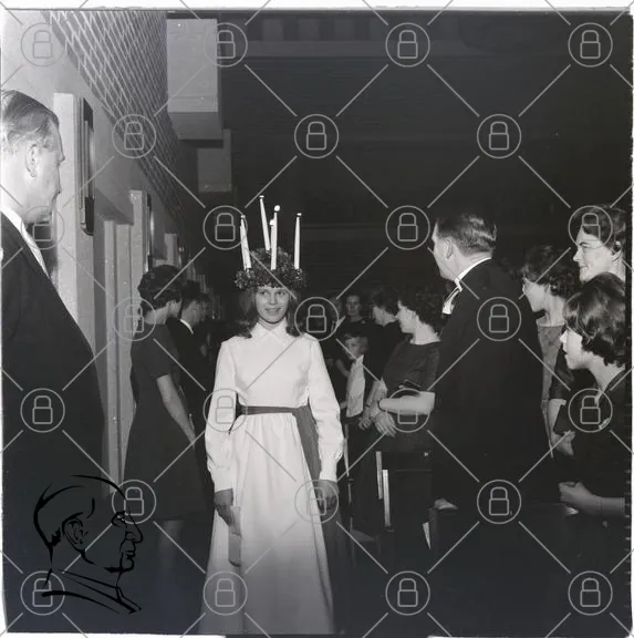 Lucia, ljuskrona, tradition, fest, klänning, krans, tärnor, jul, Sverige, folk, samling, mörker, ljus, högtid, firande, kultur, 1960-tal, svartvitt, ceremoni, glädje, gemenskap, barn, ungdomar, kläder, leenden, musik, sång, stämning, festligheter
