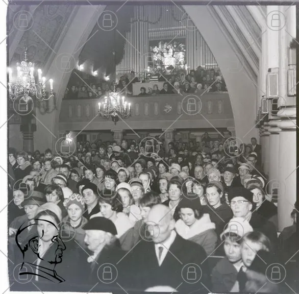publik, kyrka, människor, samling, hattar, klänningar, 1920-tal, svartvitt, inomhus, belysning, tradition, fest, evenemang, gemenskap, ansikten, stämning, dekorationer, bänkar, orgel, högtid