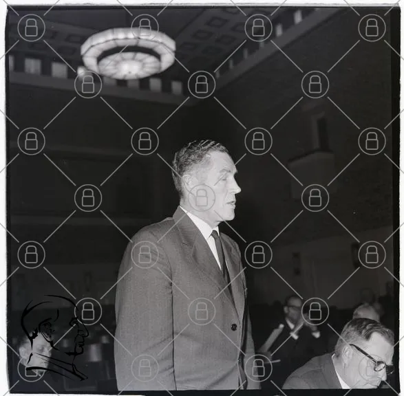 man, kostym, möte, inomhus, 1900-tal, svartvitt, stående, åhörare, kontor, formell, belysning, arkitektur, ansiktsuttryck, kläder, historisk, presentation, diskussion, allvarlig, publik, rummet