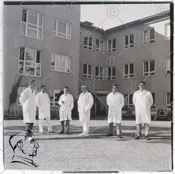 läkare, sjukhus, vitrock, grupp, utomhus, byggnad, 1950-tal, medicin, professionell, svartvitt, forskning, akademisk, medicinsk, personal, gård, traditionell, kläder, samarbete, vetenskap, hälsa, medicinsk utbildning, team, män, historisk, miljö, klinik, medicinsk personal, uniform, medicinsk forskning, sjukhusmiljö