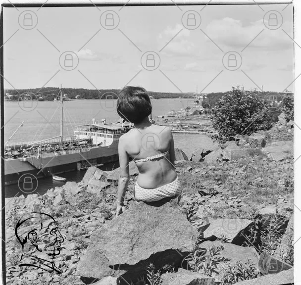 kvinna, båt, sjö, klippor, sommar, badkläder, natur, landskap, svartvitt, utsikt, vatten, träd, himmel, sol, avkoppling, strand, fotografering, retro, vintage, fritid, semester, skärgård, stillhet, lugn, panorama, horisont, båtliv, skönhet, naturupplevelse
