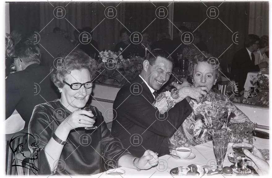fest, människor, 1960-tal, svartvit, glas, skratt, kläder, bord, blommor, socialt, samvaro, kvinnor, män, leende, dryck, festligheter, retro, minnen, sällskap, evenemang, tradition, kultur, interaktion, ansikten, gemenskap, nöje, fotografi, historia, nostalgi, stil