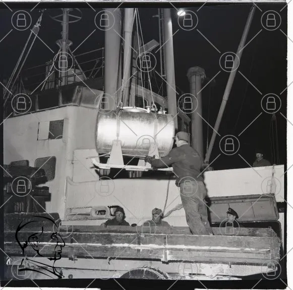 båt, lastning, natt, hamn, män, arbete, fartyg, kran, måne, last, sjöfart, industri, transport, marin, utrustning, lastbil, container, sjö, besättning, lastningsteknik, historisk, svartvit, foto, arbete, teamwork, hav