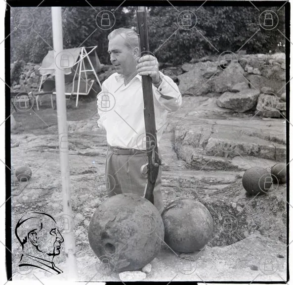 man, gevär, kanonkulor, sten, natur, utomhus, kläder, svartvitt, historia, arkeologi, landskap, sommar, fotografi, gammal, tradition, rustning, upptäcktsresande, föremål, kultur, monument