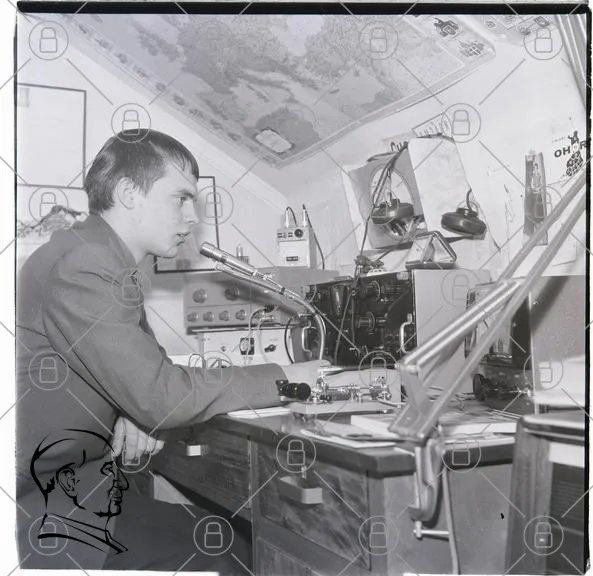 ungdom, radio, kommunikation, teknik, mikrofon, headset, skrivbord, vintage, elektronik, ljud, sändare, mottagare, hobby, 1960-tal, studier, koncentration, kontor, utrustning, amatörradio, ljudteknik, svartvitt, retro, ungdomskultur, experiment, kreativitet, forskning, ljudvågor, signaler, nätverk, radiostation