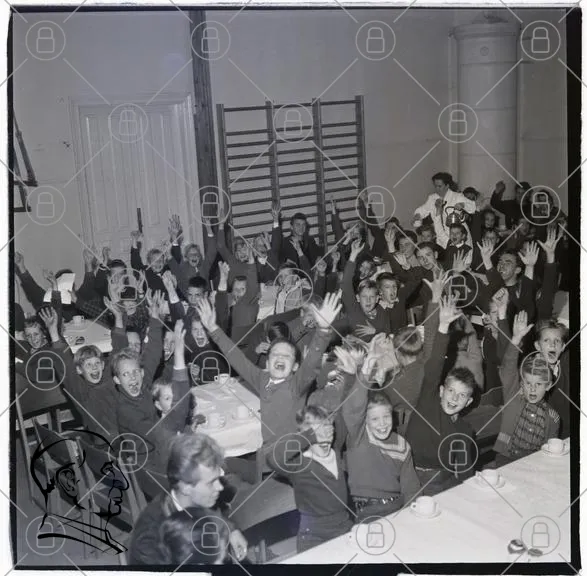 barn, glädje, fest, samling, leenden, händer, bord, stolar, vuxna, kafé, skola, 1950-tal, gemenskap, aktiviteter, firande, kläder, inomhus, mat, dryck, skratt, ungdomar, tradition, kultur, socialt, evenemang, minnen, nostalgi, grupp, interaktion, festligheter, skratta