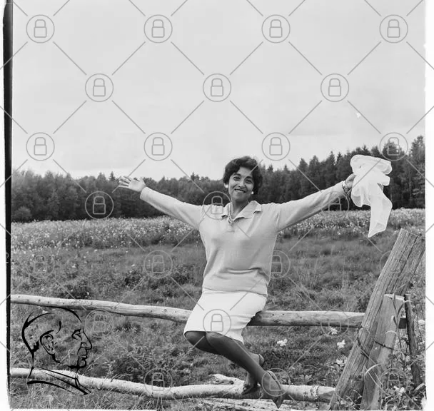kvinna, leende, natur, fält, träd, staket, kläder, svartvitt, sommar, glädje, avslappnad, hand, scarf, landskap, fotografering, utomhus, stil, pose, bakgrund, grönska
