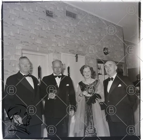 svartvitt, fest, smoking, klänning, glas, gruppfoto, inomhus, tapet, segelbåtar, formell klädsel, män, kvinna, leende, handskar, slips, fluga, väggdekoration, socialt event, mingel, elegans, 1950-tal
