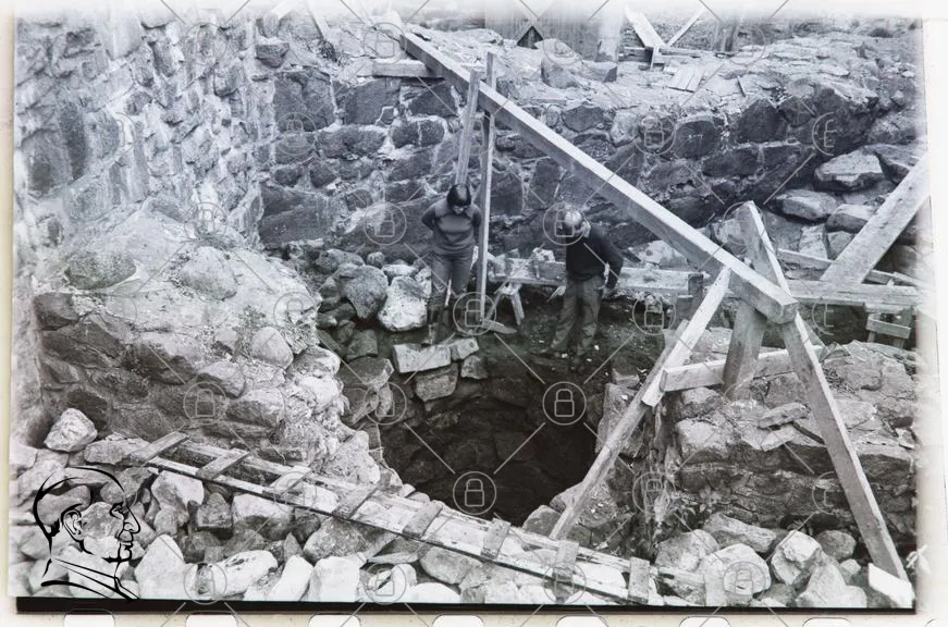 grävning, arkeologi, byggarbetsplats, män, hjälmar, sten, hål, trä, ställning, arbete, forntida, utgrävning, struktur, mark, verktyg, säkerhet, forskning, fynd, historisk, djup, landskap, ruiner, stenblock, grus, projekt, undersökning, kulturarv, bevarande, teknik, teamwork