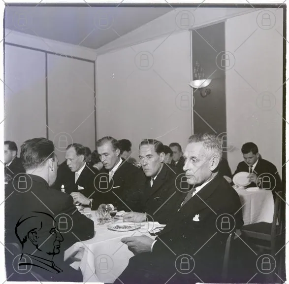 middag, män, kostym, bord, mat, glas, restaurang, svartvitt, samling, diskussion, formell, evenemang, sittande, inomhus, belysning, kläder, ansiktsuttryck, socialt, professionell, stil, 1900-tal, affärsmöte, traditionell, gemenskap, samtal, uppvaktning, elegans, atmosfär, interiör