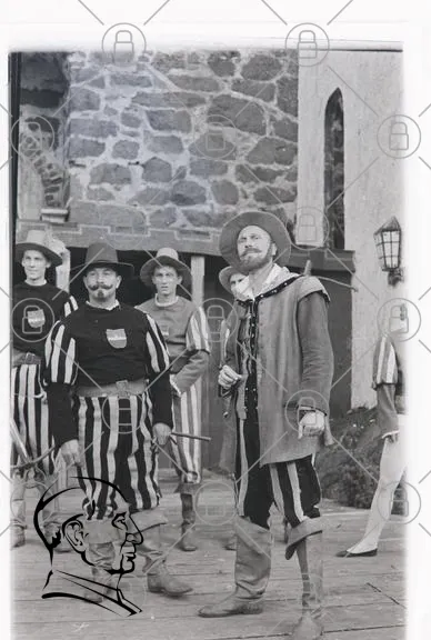 historisk, kostymer, medeltid, teater, skådespelare, svartvitt, kläder, hattar, svärd, scen, gammal, tradition, uppträdande, grupp, män, byggnad, sten, ljuskälla, rekvisita, kultur, föreställning