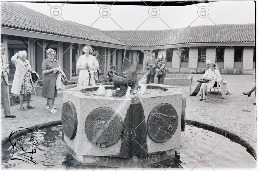 fontän, skulptur, gård, människor, svartvit, BORNHOLM, konst, byggnad, trädgård, sittplatser, 1960-tal, kultur, utomhus, vatten, detaljer, keramiska plattor, besökare, arkitektur, historia, samling