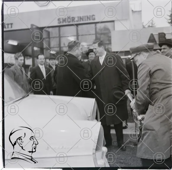 historisk, svartvit, bild, män, kläder, möte, bil, smörjning, företag, 1900-tal, affärsmän, handskakning, entré, grupp, fotografi, kontor, utomhus, stil, tradition, samarbete, vänskap, service, teknik, industri, reklam, logotyp, Sverige, 1950-tal, ceremoni, händelse