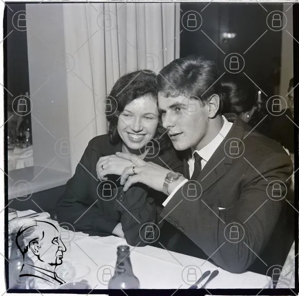 par, middag, restaurang, leende, kläder, 1960-tal, svartvitt, bord, glas, flaskor, inredning, socialt, fest, ungdomar, samtal, skratt, eleganta, sällskap, mat, dryck, interiör, vänskap, romantik, stil, uttryck, ansikten, atmosfär, minnen, nostalgi
