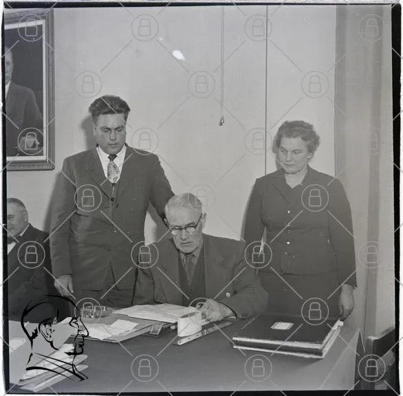 möte, skrivbord, dokument, män, kvinna, glasögon, papper, kontor, porträtt, 1940-tal, affärsmän, diskussion, ledarskap, administration, svartvitt, formell, kläder, anteckningar, skrivande, professionell