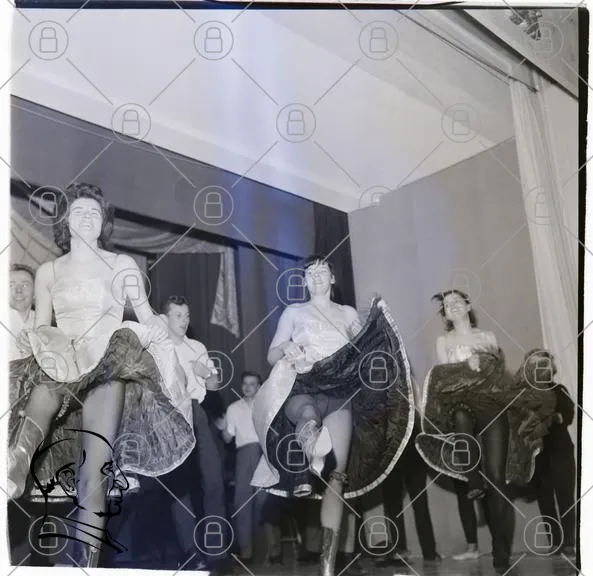 dans, kvinnor, scen, kostymer, underhållning, 1950-tal, svartvitt, fest, musik, rörelse, ben, klänningar, publik, show, dansnummer, glädje, tradition, koreografi, dansare, stil, retro, evenemang, festlighet, uppträdande, danssteg, glamour, artistisk, uttryck, samspel, socialt, kultur