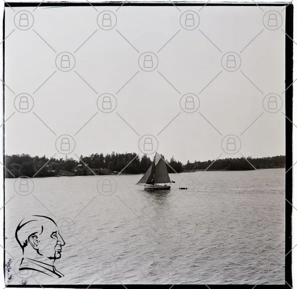 segelbåt, sjö, vatten, segel, träd, horisont, himmel, kust, natur, landskap, sommar, skärgård, båtliv, fritid, segling, svartvitt, fotografi, utomhus, avkoppling, stillhet