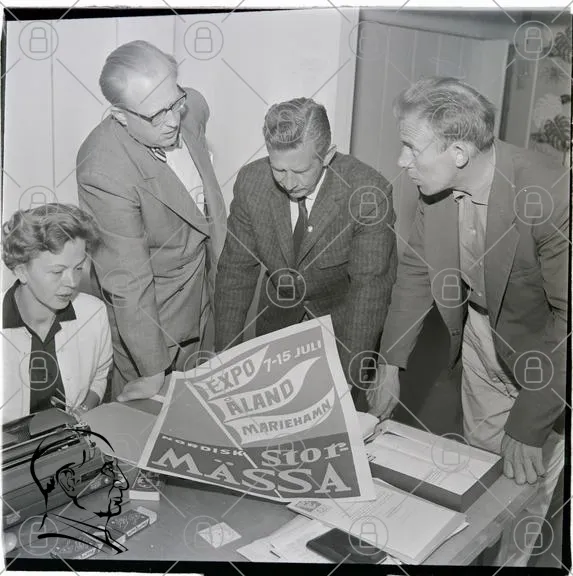 möte, personer, dokument, skrivbord, typografisk, skylt, Expo, Åland, Mariehamn, 7-15 juli, stor, massa, svartvitt, kontor, 1960-tal, affisch, diskussion, papper, skrivmaskin, kläder, man, kvinna, ansiktsuttryck, samarbete, planering, presentation
