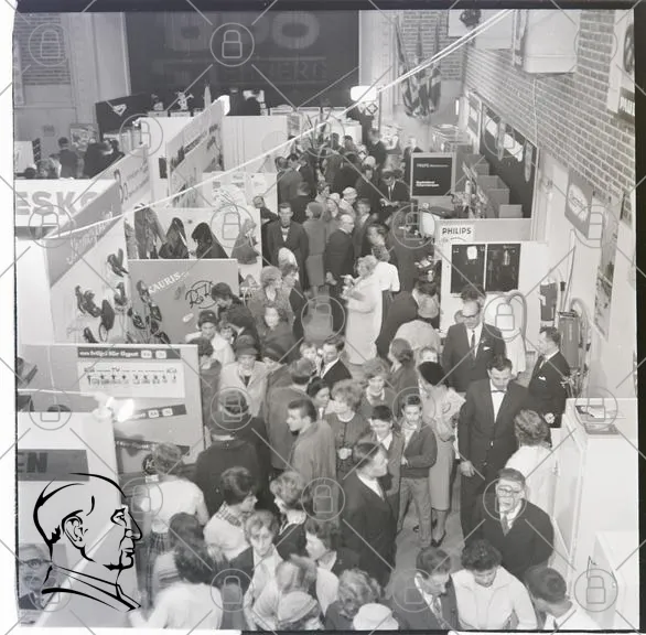 mässa, utställning, människor, 1960-tal, affärsmontrar, kläder, företag, folkmassa, reklam, teknik, produkter, fotografering, evenemang, socialt, interaktion, vintage, svartvitt, samling, information, nätverkande, besökare, stånd, presentation, kommunikation, industri, design, innovation, kultur, historia, marknadsföring, företagande