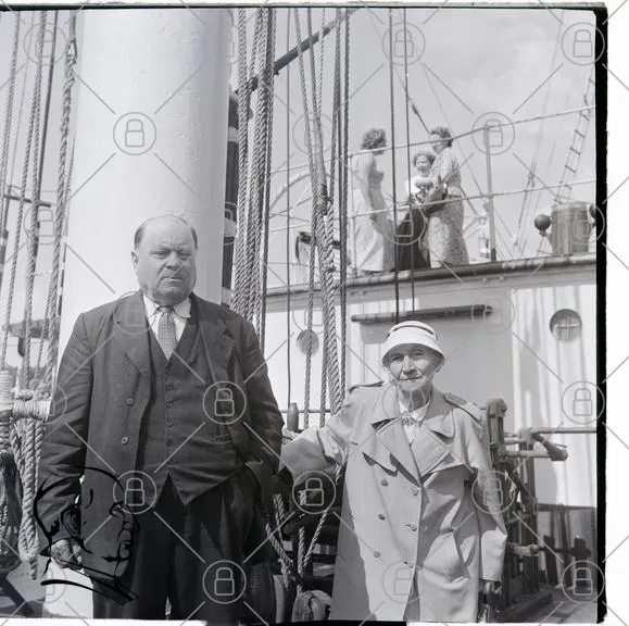 båt, segelbåt, människa, kvinna, kläder, hatt, sjö, segel, gammal, svartvitt, fotografi, rederi, hamn, trä, rep, mast, segling, par, stil, 1900-tal, historia, resande, turister, däck, sjöfart, tradition, familj, äldre, vänner, samling
