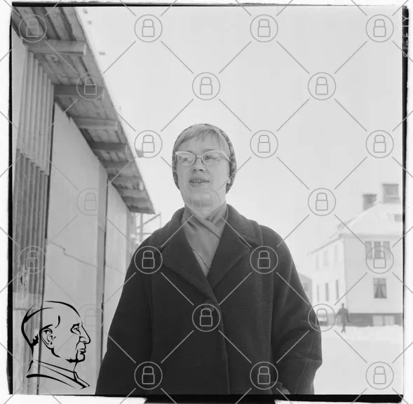 kvinna, glasögon, vinter, snö, svartvitt, kläder, gata, byggnader, mössa, leende, porträtt, utomhus, 1960-tal, stil, svensk, fotografi, historisk, person, landskap, arkitektur