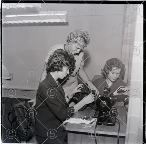 sy, sömnad, kvinnor, arbete, maskin, textil, hantverk, utbildning, 1960-tal, kläder, kreativitet, samarbete, klassrum, handarbete, retro, mode, design, lärare, elever, sykurs, handarbete, syprojekt, tyg, symaskin, lärande, tradition, gemenskap, kvinnligt, yrke, hantverkskonst