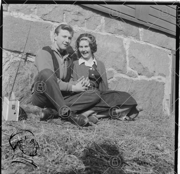 par, ungdomar, 1950-tal, svartvitt, stenvägg, kläder, radio, skratt, kärlek, natur, gräs, sittande, leende, vintage, fotografi, romantik, stil, ungdomlig, traditionell, avslappnad