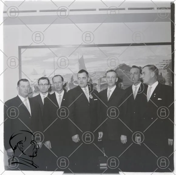 svartvitt, gruppfoto, män, kostymer, slipsar, inomhus, porträtt, 1950-tal, möte, väggmålning, formella kläder, affärsmän, historiskt, samarbete, traditionell, stil, professionell, representation, samling, art deco