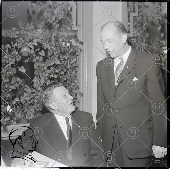 män, kostym, samtal, restaurang, 1950-tal, svartvitt, leende, bord, växter, inredning, affärsmän, kläder, socialt, event, traditionell, elegans, stil, möte, vänskap, historisk, porträtt, interiör, fest, samvaro, diskussion, uttryck, ansikten, kroppsspråk, atmosfär