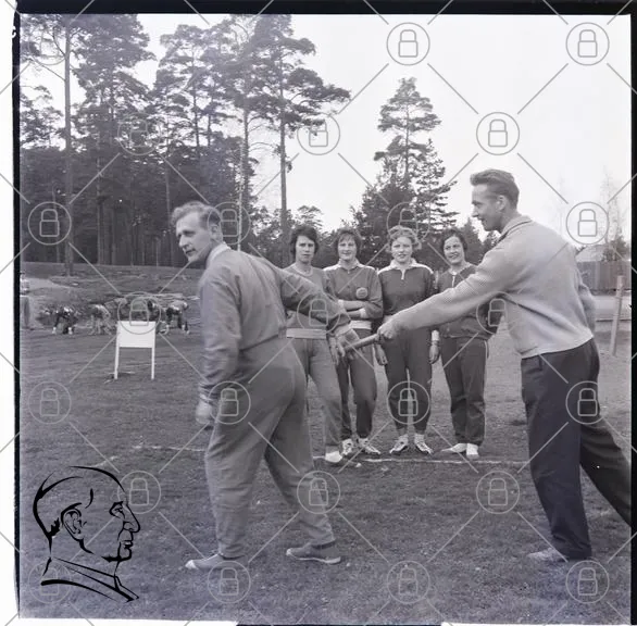 idrott, tävling, lag, sport, träning, utomhus, män, kvinnor, 1950-tal, gymnastik, samarbete, leenden, natur, gräs, motion, tradition, grupp, aktivitet, prestation, glädje